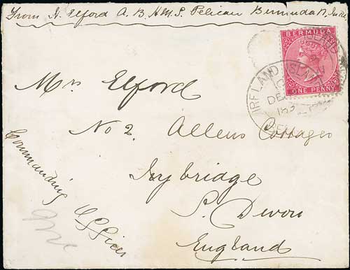 1897 (Dec 8) Cover to England headed "From H. Elford, A.B HMS Pelican, Bermuda W. Indies" and countersigned, franked 1d tied by "IRELAND IRELAND / BERMUDA" datestamps, flap missing, otherwise a fine 1d concession
