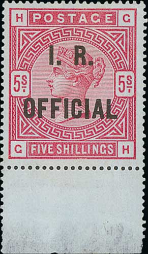 Inland Revenue. 1885 5/- Rose on blued paper, GH mint with lower margin, pencil inscription on reverse of margin "W.H Peckitt, £9 1906", margin thinned, the stamp fine and rare. With B.P.A Certificate