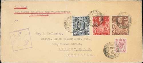 1941 (Nov 28) Commercial cover from Woking to Australia via North Atlantic and Transpacific air service, franked KGVI 6d, 2/6 brown, 5/- and 10/- dark blue paying the 18/- rate, Australian censors on both sides.