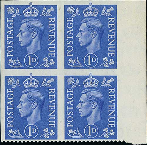 1951 KGVI 1d Light ultramarine, unmounted mint block for four with margin at right, the lower pair with perforations at base, imperforate on all other sides resulting in the upper pair being totally imperforate,