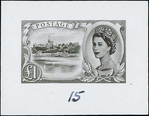 1955 2/6 - £1 QEII Castles definitives, photographic stamp size essays of fifteen unadopted designs, numbered 1 - 15, comprising 2/6 (7), 5/- (3), 10/- (3) and £1 (2) designs by J. Hassell ("1" - "6"),