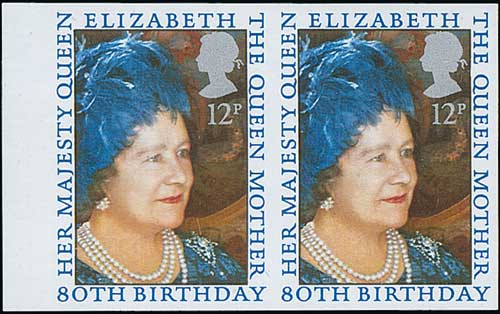1980 Queen Mother 80th Birthday 12p imperforate horizontal marginal pair, superb unmounted mint, just 20 pairs recorded by Pierron. S.G 1129a. Photo on Page 16. (Image1)