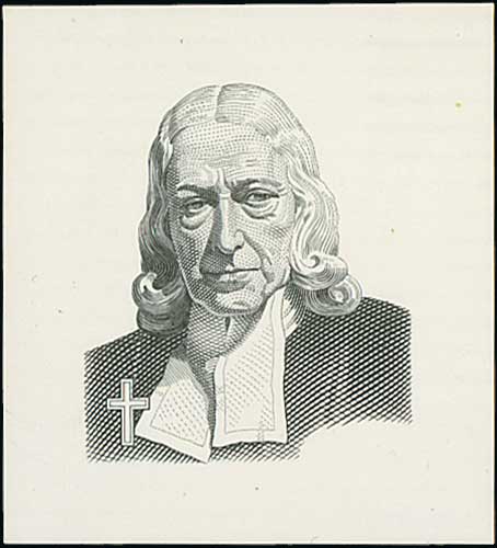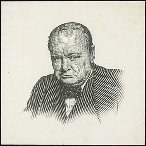 Jersey. 1974 Jersey Anniversaries Issue, die proofs in black on thin card of the vignettes of John Wesley, Sir William Hillary and Winston Churchill (used for the issued 3p, 3½p and 20p stamps), and two die