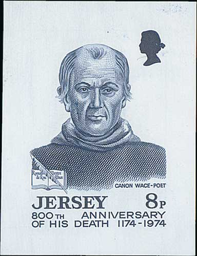 with horizontal gum lines on reverse, the 8p proof without wording with some surface faults along these horizontal lines. Also two original photos of Robin Taylor engraving the 8p die at De la Rue's, Jersey Stamp Bulletin and Stamp Monthly