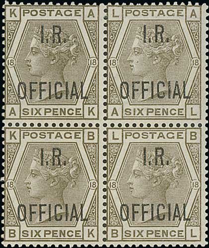 Inland Revenue. 1882 6d Grey plate 18, AK-BL block of four fine mint, the lower pair unmounted, very scarce so fine. S.G. O4. Photo on Page 42. (Image1)