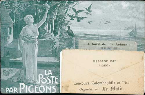 1003 image1905 (July 22) Pigeongram flown from the ship "Ariane" in the Channel to Le Havre, placed within an envelope attached to a special postcard produced by the newspaper "Le Matin" who sponsored the flight, the card posted from Le Havre to Paris franked 15c, fine and rare. Photo on Page 122. (Image1)