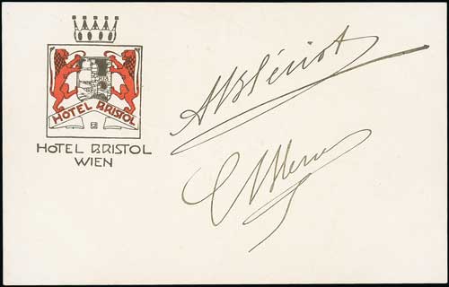 1005 imageBleriot. 1909 (Oct 28) Hotel Bristol envelope posted within Vienna franked 10h, similar Hotel Bristol postcard enclosed signed by Bleriot and his wife. Bleriot made two demonstration flights the previous day in front of the Austrian Emperor and 300,000 spectators. A fine and uncommon autograph. Photo on Page 132. (Image1)