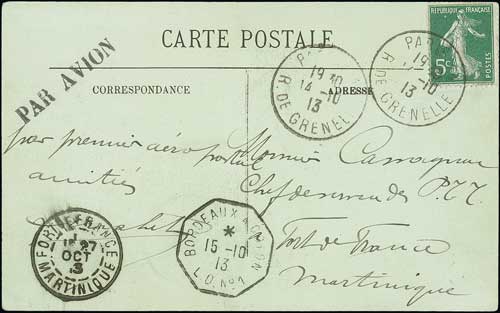 1023 image1913 (Oct 14) Postcard from Paris to Martinique franked 5c, flown from Paris to Bordeaux on October 15th handstamped "PAR AVION", with octagonal "BORDEAUX A COLON / L. D. No 1" datestamp (Oct. 15) and Fort de France arrival c.d.s (Oct. 27). This flight carried a small quantity of mail for the West Indies, which was able to leave by boat from Bordeaux on the same day. Fine and very scarce. Photo on Page 132. (Image1)