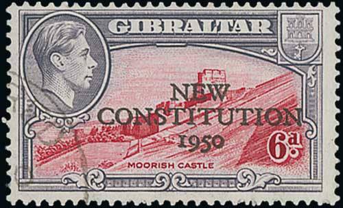 1063 image1950 New Constitution 6d, variety overprint double, fine used. With B.P.A Certificate (1987). S.G. 142a, £1,300. Photo on Page 178. (Image1)