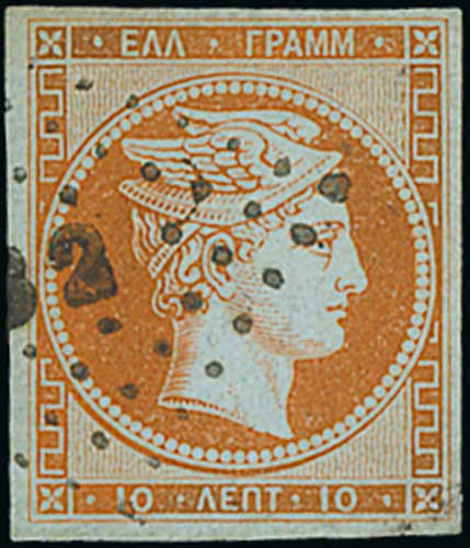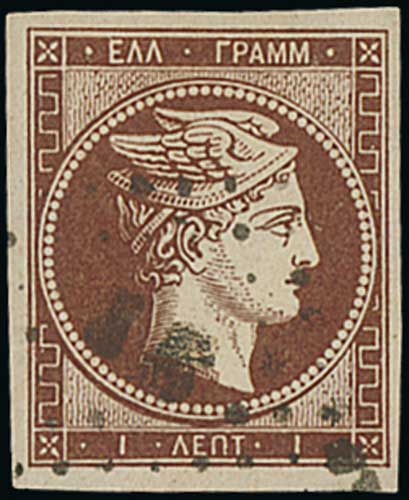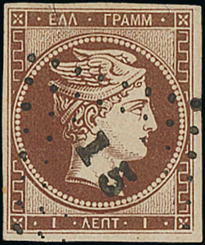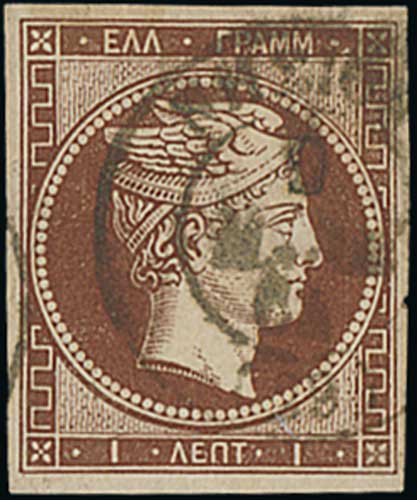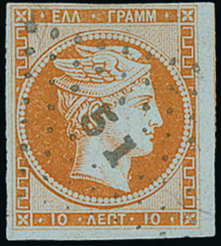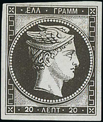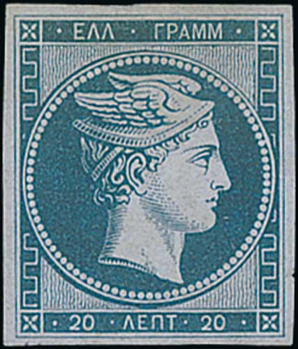 1071 image1861 Provisional Athens Printing, 20L prussian blue without numeral on reverse, coarse print with quadrille background, four small to good margins, faintest trace of a crease, otherwise fine used with "1" cancel, ex Alphonse collection, very scarce. S.G. 10A, V. 9. Photo included on Front Cover. (Image1)