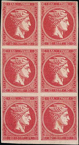 1080 image1862-67 Consecutive Athens Printing 80L rose-carmine mint block of six (2x3), fine and attractive. Photo on Page 120. (Image1)
