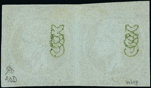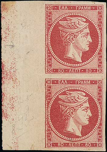 1081 image1862-67 Consecutive Athens Printings, 80L carmine vertical pair with margin at left, upper stamp with "8" inverted on reverse, mint, large part original gum, very scarce, with Holcombe Certificate (1991). S.G. 22/c, V. 34/b. Photo on Page 194. (Image1)