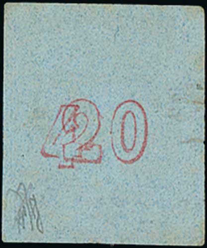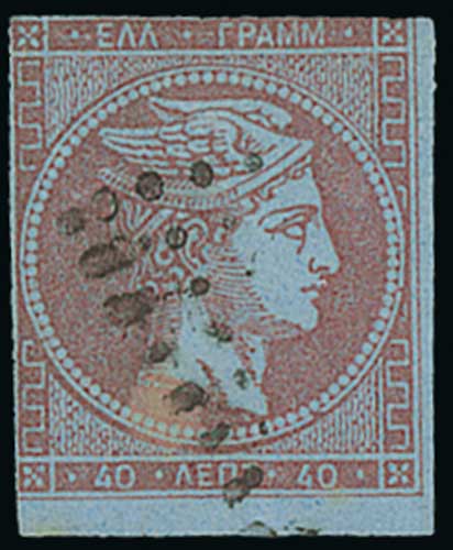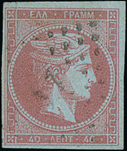 1083 image1868 Athens Printings from cleaned plates, 40L with "20" control on reverse corrected to "40", three used examples all with four margins, one with two small tears at left, one thinned, the third apparently fine. S.G. 28b, V. 40c. (3). Photo on Page 130. (Image1) (Image2) (Image3) (All Images)