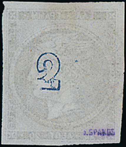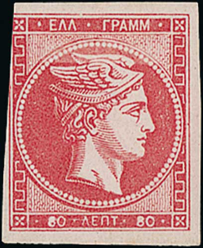 1085 image1871 Athens Printing on inferior quality paper, 80L carmine-rose with control variety "8" for "80" (a tiny part of the "0" showing, as is usual for this variety), mint original gum, three large margins, cut into at upper left. With the original inscribed sheet of paper upon which this stamp was mounted when presented in 1899 by Dr Emilio Diena to W. Dorning Beckton at the Manchester Philatelic Exhibition, and the write-up pieces from Dorning Beckton's album page. A rare variety mint. S.G. 39c, V. 41e. Photo on Page 130. (Image1)
