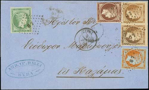 1100 1863-72 Covers, entire letters and entires addressed to Russia (5, one registered), G.B (8), Holland, Italy (14, one disinfected) or Turkey (2), various Athens Printings, rates include 30L, 40L 65L, 70L, 100L, 140L, 160L, 170L, 190L, 200L and 460L, some faults. (30).