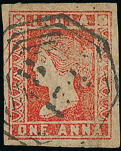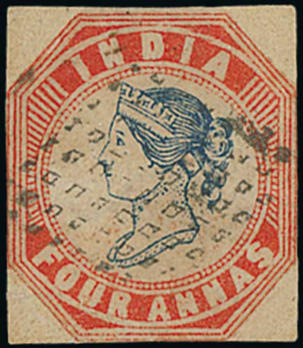 1383 imageIndia Used in Singapore. 1854-66 India stamps comprising 1854 4a, head die III frame die II with the distinctive lozenge cancel of Singapore, 1854 1a die II and 2a (both four margins), 1856-66 2a yellow, 2a dull pink, 2a yellow buff, 4a black and 8a (2) all cancelled "B/172", the 1854 4a a cut to shape stamp with corners added but still scarce. S.G. Z62, 64, 67, 72/4, 76, 78. (9). Photo on Page 178. (Image1) (Image2) (All Images)