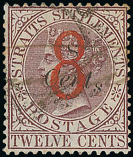1395 image1884 (Sept) 8 on 8c on 12c Brown-purple, variety "s" of "Cents" low, a couple of tiny perf tones, otherwise fine used, very scarce. S.G. 80c, £4,750. Photo on Page 178. (Image1)