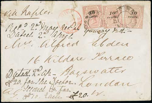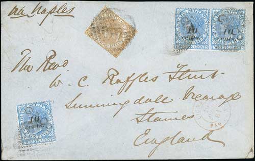 1883 (Apr 3) Cover to London via Naples franked by three 10c on 30c surcharges (S.G. 46) cancelled undated circular "SINGAPORE / P.O", red Singapore Paid c.d.s. Closed tears at upper edge and upper left corner