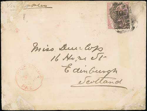 1880 (Apr 7) Cover to Scotland via Naples franked 10 on 30c (S.G. 34) cancelled overinked "B/172", red Singapore Paid c.d.s, surface faults at corners, the latest recorded of the "B/172" cancel (Proud K5) which
