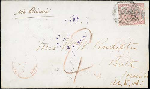 1880 (May 8) Cover with enclosed letter from an American sailor, to his sister in New York via Brindisi, franked 10 on 30c (S.G. 34, straight edge at left where wing margin trimmed prior to surcharging) tied by