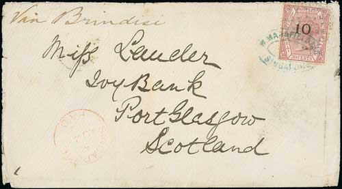 1880 (Aug 2) Cover to Scotland via Brindisi franked 10 on 30c (S.G. 35) tied by W. Mansfield & Co senders cachet and light circle of dots, red Singapore Paid c.d.s, a couple of small edge tears but a scarce stamp