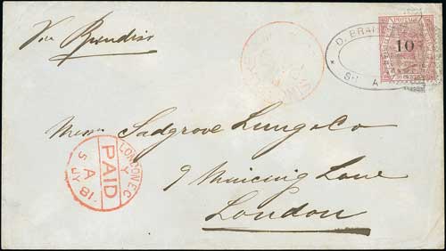 1881 (June 2) Cover to London via Brindisi franked 10 on 30c (S.G. 33) tied by oval senders cachet and light circle of dots, red Singapore and London Paid datestamps. Very light vertical crease through stamp,