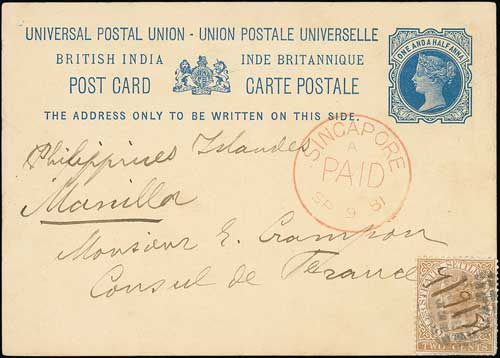1881 (Sep 9) India 1½a postcard franked 2c brown cancelled by circle of dots (Proud K19) and manuscript "7/9/81" date, addressed to the French Consul in Manila, with superb red "SINGAPORE / PAID" c.d.s, fine