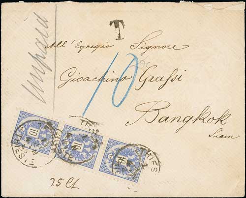1884 Cover from Trieste to Bangkok franked 10kr vertical strip of three, handstamped "T" and endorsed "unpaid" with a "10" charge in blue crayon, backstamped with red "SINGAPORE / PAID" datestamp (PD11, code B)