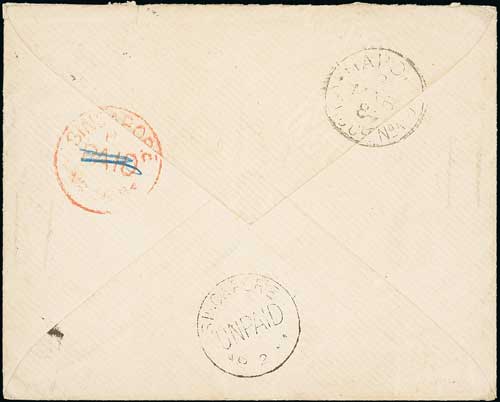 applied in error, "Paid" crossed out in crayon and replaced by black "SINGAPORE / UNPAID" c.d.s (UP9 without code letter, AP 2, latest recorded date). Very unusual. Photo on Page 174. (Image1) (Image2)