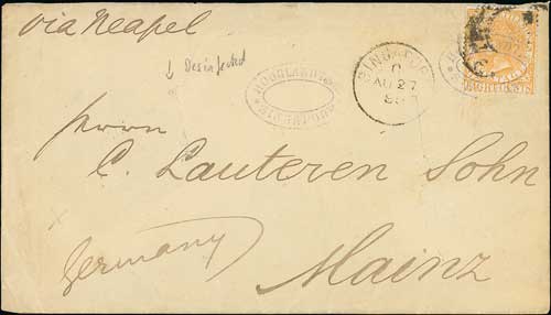 1886 (Aug 27) Cover to Germany via Naples franked 8c orange tied by Hooglandt & Co cachet and indistinct cancel, Singapore c.d.s alongside, disinfected with two slits due to the cholera outbreak in Italy, an