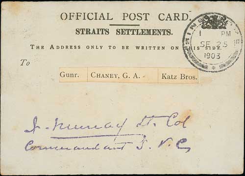 1903 (Sep 25) Straits Settlements Official Post Card with small arms at right, posted within Singapore to "Gunr. Chaney, G.A, Katz Bros" with violet cachet "A. Murray Lt. Col / Commandant S.V.C", the reverse with
