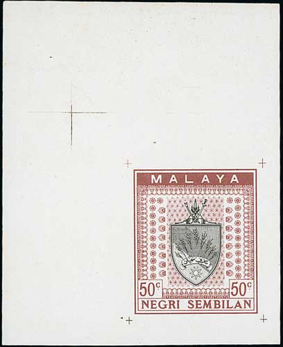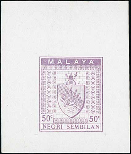 1504 image1933 50c Survey Department essays, the fine collection comprising Norris types D, E (3), G, H (12), I (2) in various differing colours, also type K block of four and single in combination with Pahang essay both in black, type H and J sheets of four both in green. (33). Photo on Page 240. (Image1) (Image2) (All Images)