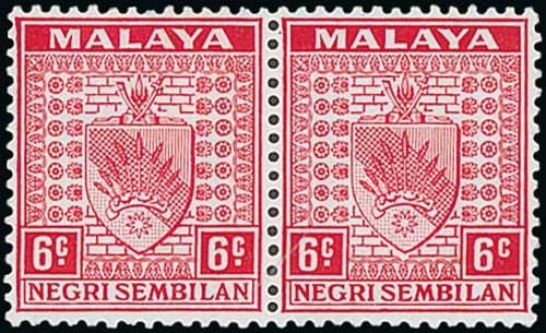 1508 image1937 6c Scarlet, stop omitted at right, mint (within a pair, the variety unmounted) and used. S.G. 27a, £1,200. (2). Photo on Page 178. (Image1) (Image2) (All Images)