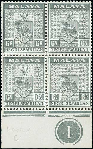1509 image1941 6c Grey, mint control block of four, the lower right stamp with stop omitted at right, lightly mounted on the upper pair only, the variety unmounted. S.G. 28/a, £365+. Photo on Page 240. (Image1)