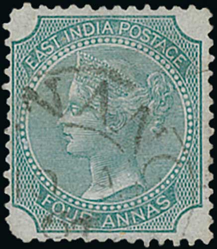 1525 imageIndia Used in Penang. 1854 1a die 1 and 1856 8a carmine both cancelled "B/147", also 1856 4a black and 1865 4a green cancelled by Penang c.d.s. S.G. Z21, 35, 42, 50, £1,125. (4). Photo on Page 178. (Image1) (Image2) (All Images)