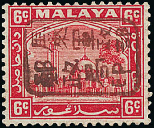 1563 image1942 Selangor 6c scarlet with sideways boxed type 1 handstamped overprint in brown, fine mint, scarce. S.G. J212b, £1,300. Photo on Page 198. (Image1)