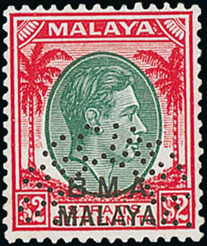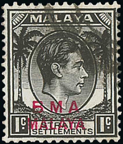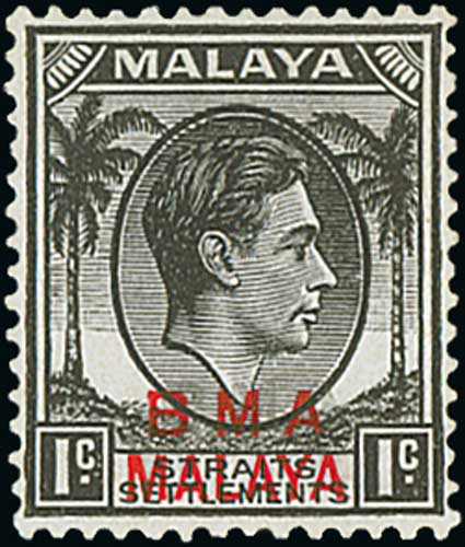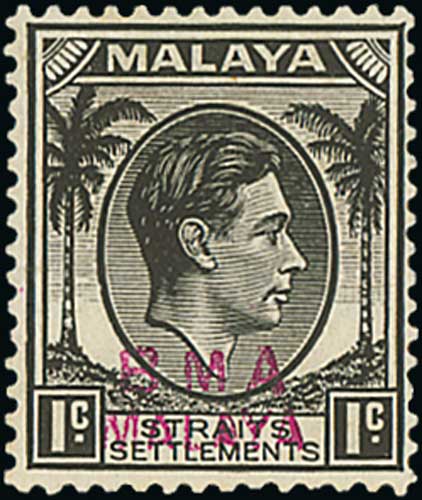 1571 image1945 1c Black with "B.M.A / MALAYA" colour trial overprint in bright magenta, using the plate sent to Kuala Lumpur to overprint the large stocks of stamps supplied prior to the occupation, mint with the brown gum typically found on pre-occupation issues, very scarce. Photo on Page 198. (Image1)