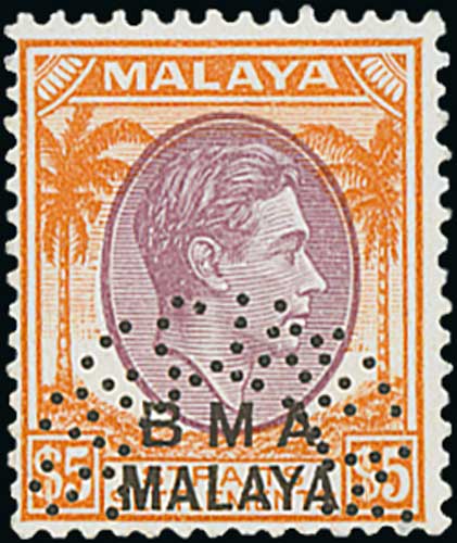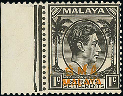 1570 image1945 Marginal 1c Black with "B.M.A / MALAYA" colour trial overprint in orange, using the plate sent to Kuala Lumpur to overprint the large stocks of stamps supplied prior to the occupation, unmounted mint with the brown gum typically found on pre-occupation issues, very scarce. Photo on Page 198. (Image1)
