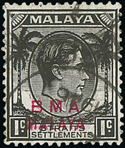 1573 image1945 1c Black with B.M.A overprint in magenta, fine used with 2 JA 1946 c.d.s (known examples with dated cancels all apparently used in Singapore in December 1945 or January 1946). With B.P.A Certificate (2024). S.G. 1ab, £1,500. Photo on Page 198. (Image1)