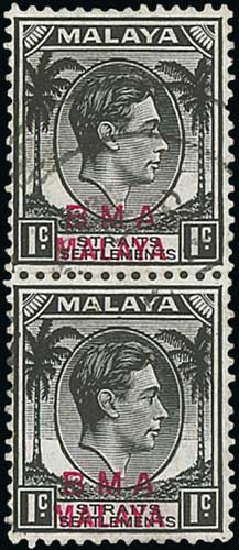 1574 image1945 1c Black vertical pair with B.M.A overprint in magenta, fine used. The only recorded multiple with this magenta overprint. Ex. Dr F.E Wood. S.G. 1ab, £3,000. Photo on Page 164. (Image1)