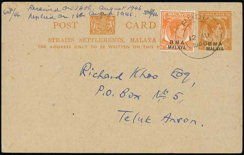 1601 image1946 2c Orange postcard with local BMA overprint, bearing a 2c stamp, unused or used from Pudu to Teluk Anson with commercial message, also a piece with Raub c.d.s. A rare card used. (3). Photo on Page 196. (Image1)