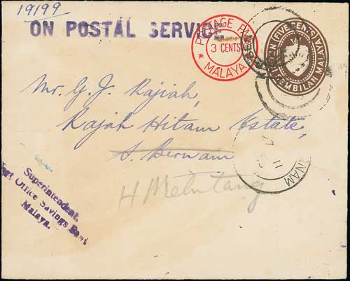 1619 imageOfficial Envelopes. 1946 Envelopes from the Superintendent, Post Office Savings Bank, in Kuala Lumpur, all using prewar KGVI stationery invalidated by undated "BENTA" double circle and handstamped violet "ON POSTAL SERVICE", the envelopes comprising Straits 5c with large red "POSTAGE PAID / 3 CTS / MALAYA" handstamp alongside (3), Selangor 5c, Negri Sembilan or Selangor 5c both with red "POSTAGE PAID / 3 CENTS / MALAYA" alongside, a scarce group. (6). Photo on Page 196. (Image1)