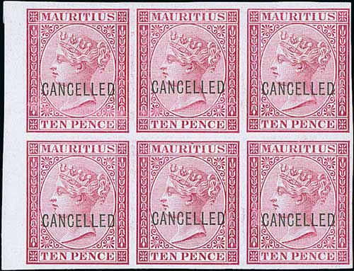1639 image1871-74 1d Brown, 2d blue, 4d rose, 6d green, 10d maroon and 1/- yellow imperforate plate proof blocks of six on glazed paper, each stamp overprinted "CANCELLED" type D7, creases to one 6d and one 1/- stamp, otherwise all unusually fine. (6 Blocks). Photo on Page 194. (Image1)