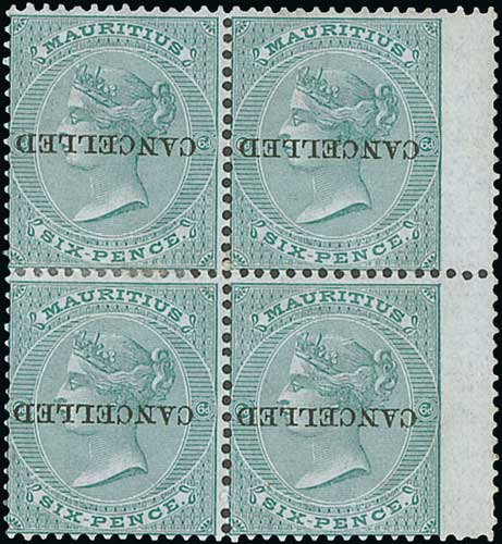 1641 image1878 "CANCELLED" overprints on 1863-72 issue 1d, 3d, 6d and 1/- yellow blocks of four, all with the variety overprint inverted, this variety not recorded by Samuel, minor creasing but very scarce. (4 Blocks). Photo on Page 194. (Image1)