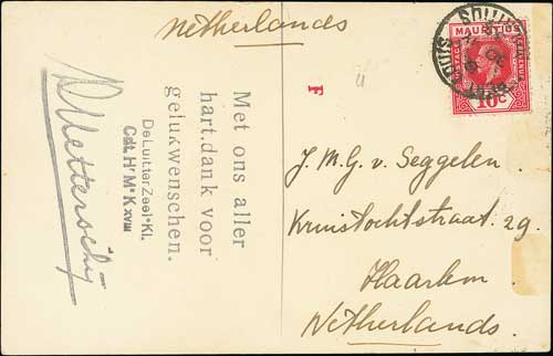 1643 image1935 (May 30) Picture postcard of the Dutch Submarine KXVIII and printed signatures of the crew, posted from Mauritius to Holland whilst the submarine was visiting Port Louis as part of its world tour, with violet cachet and signature of the Captain, very scarce. Photo on Page 196. (Image1)