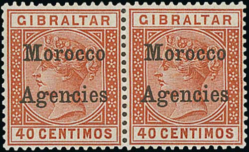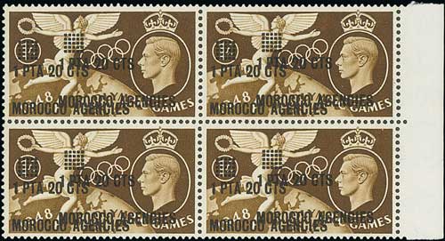 1648 imageSpanish Currency. 1948 Olympic Games 1p20c on 1/-, variety surcharge double, a mint marginal block of four, mounted on two stamps with two other stamps unmounted. Very scarce, with B.P.A Certificate (1987). S.G. 181a, £6,000. Photo on Page 180. (Image1)