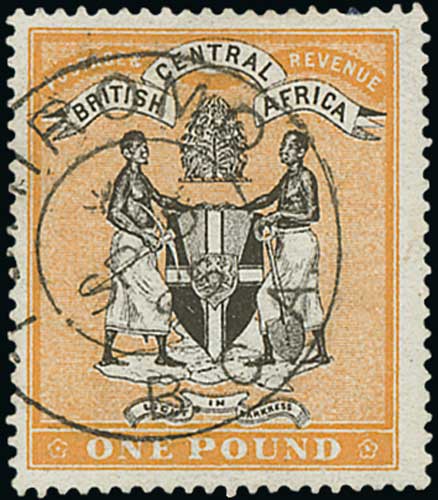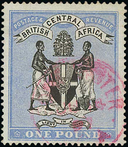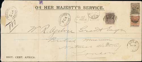 1677 image1894 (May 17) Long O.H.M.S cover from Zomba to "W.R Ogilvie Grant, British Museum, Natural History London" with 4d, 1/- and 2/6 B.C.A overprints tied by numeral cancels, datestamps of Zomba, Blantyre, Tshinde and London, oval "REGISTERED / B.C.A / LETTER". Manuscript "no 10/- stamps" (referring to the original contents?), vertical fold at left, otherwise fine and a very scarce commercial use of the first issue 1/- and 2/6 grey-purple. Photo on Page 200. (Image1)