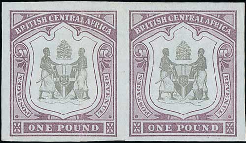 1682 image1897 £1 Black and dull purple, imperforate plate proof pair on gummed watermarked Crown CC paper, left stamp creased, reverse with offsets from another stamp, good appearance and scarce. Photo on Page 210. (Image1)