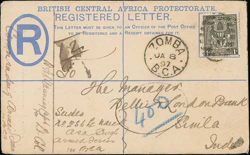 1686 image1897 (Jan 8) 4d Registration envelope size F sent to India at the 1d soldiers concession rate, endorsed "sender no 256 LC Naick Asa Singh, Armed Forces in BCA" and countersigned by the Commanding Officer (Capt. W.H Manning, for the Lt. Col.), the 1d stamp cancelled "863" with a Zomba c.d.s alongside, backstamped at Chinde, Sea Post Office and Simla, with oval handstamp applied on the Bombay-Aden Sea Post Office containing the manuscript registration number. A fine and rare registered soldiers concession rate cover to India. Photo on Page 200. (Image1)