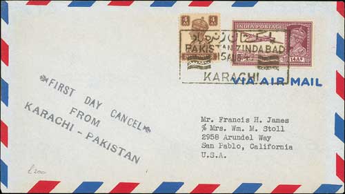 1700 image1947 (Oct 1) First Day Cover to the USA bearing 3p - 14a Pakistan overprints cancelled by boxed "PAKISTAN ZINDABAD" Independence Day cancels of Karachi, a scarce cancel on an F.D.C. Photo on Page 200. (Image1)